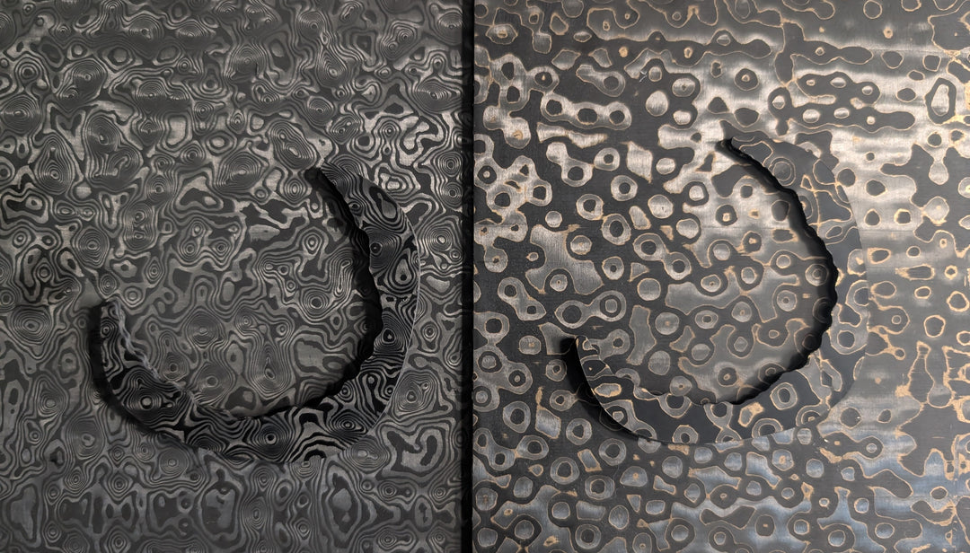 The art of the folded samurai blade married to the modern miracle that is carbon fiber. Two exquisite Damascus forged carbon fiber inlays. For a more reserved look, the 600 layered Damascus forged in black, and for a hint of shimmer, the 300 layered Gold forged.